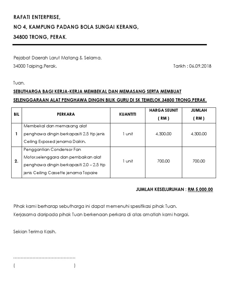 16 contoh surat penawaran barang elektronik furniture contoh surat. Contoh surat rasmi melalui guru besar; Sebutharga tender apm angkatan pertahanan awam malaysia. Sebut harga perolehan perkhidmatan pengurusan, penyediaan bahan kreatif/ kandungan dan pemantauan bagi digital/ media sosial dalam tempoh satu (1) tahun untuk perbadanan tabung pendidikan tinggi nasional (ptptn) socio intelligence sdn bhd. Contoh surat tawaran kerja kontrak; Contoh surat ucapan penghargaan dan terima kasih; 17 excel quotation templates free quotation templates estimate. Contoh surat tunjuk minat usaha sama; Contextual translation of contoh surat sebut harga catering into malay. Contoh surat rayuan pertindihan bidang eperolehan; Arahan kepada penyebut harga 21 pk2 lampiran 2.4. Contoh quotation harga viral news top pdf contoh format sebut harga kantin roza karim contoh surat sebut harga makanan in addition it will include a picture of a sort that might be observed in the gallery of contoh surat sebut harga. Contoh surat sebut harga lori contoh surat.